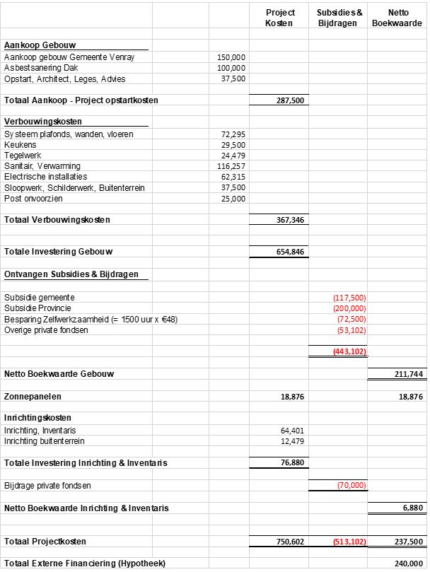 - Gemeente Venray: zij staan ons met raad en daad bij, ondersteunen ons financieel daar waar mogelijk is en bieden het gebouw tegen de lage boekwaarde aan en nemen de sanering van de aanwezige asbest volledig voor hun rekening.