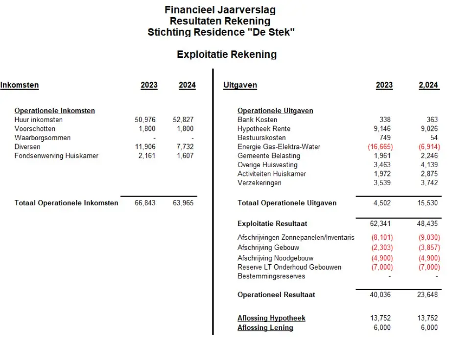 Het bruto exploitatie resultaat over boekjaar 2024 bedraagt € 48.435. Na aftrek van afschrijvingen en de reservering voor Lange Termijn Onderhoud resteert een positief netto resultaat van € 23.648, dat toegevoegd kan worden aan de algemene reserves.